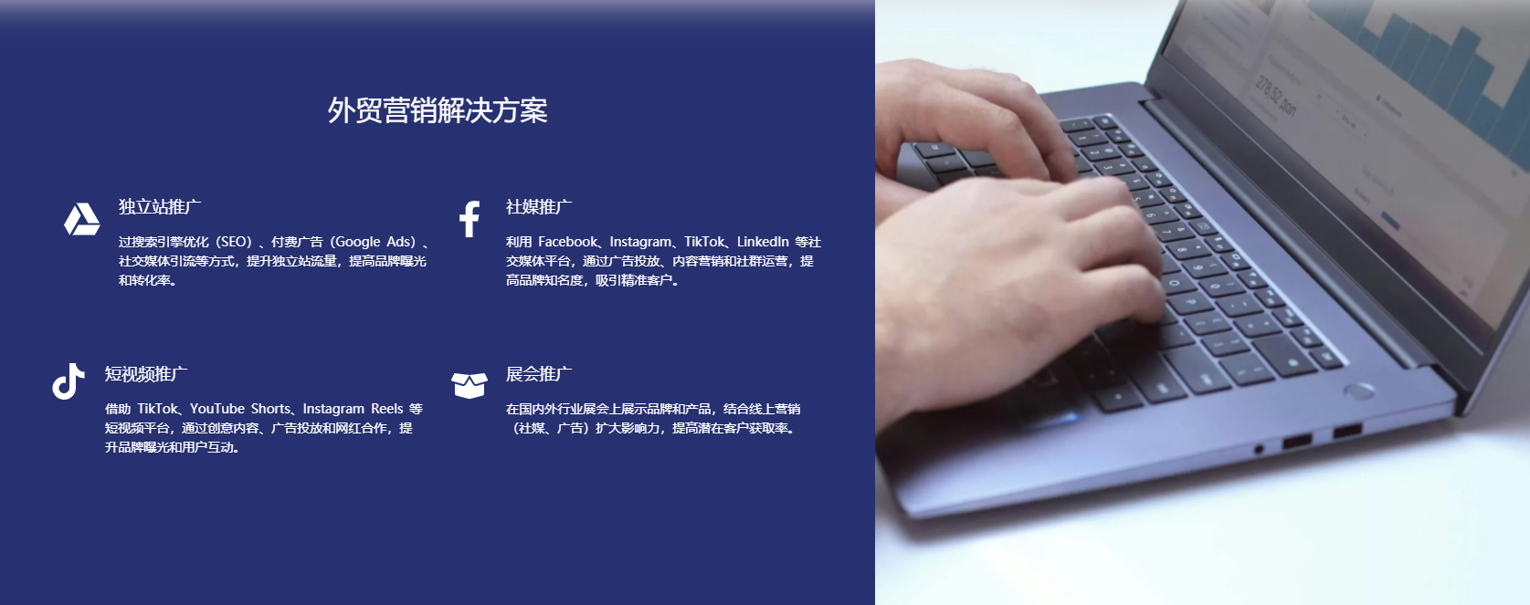 ?   三大基石服務:其服務板塊明確分為三部分:一是通過“獨立站建站+搜索引擎推廣”筑牢流量基石;二是運營Facebook、LinkedIn等社交媒體矩陣以鏈接商業人脈;三是發力TikTok等跨境短視頻營銷,開拓流量新藍海。